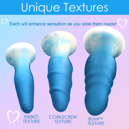 Three Textured Plugs: Ranging from small to medium to large, these three plugs also have unique textures too! The small one is ribbed, the medium has a corkscrew, and the large one has bumpy dips. Each will enhance sensation in different ways as you slide them inside!