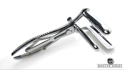 New chrome plated brass medical speculum is used to spread tissue for anal examination.