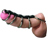 Your slave shouldn’t be able to get an erection without your permission! Push that cock through five confining rings, encircling those balls with it in the largest of the rings. Everytime he begins to get hard, the rings will dig into his sensitive flesh! Being squeezed in the flexible cage will arouse him, and you’ll love watching him squirm in pain! A small D-ring at the end even allows you to attach a leash and lead him around by his dick!