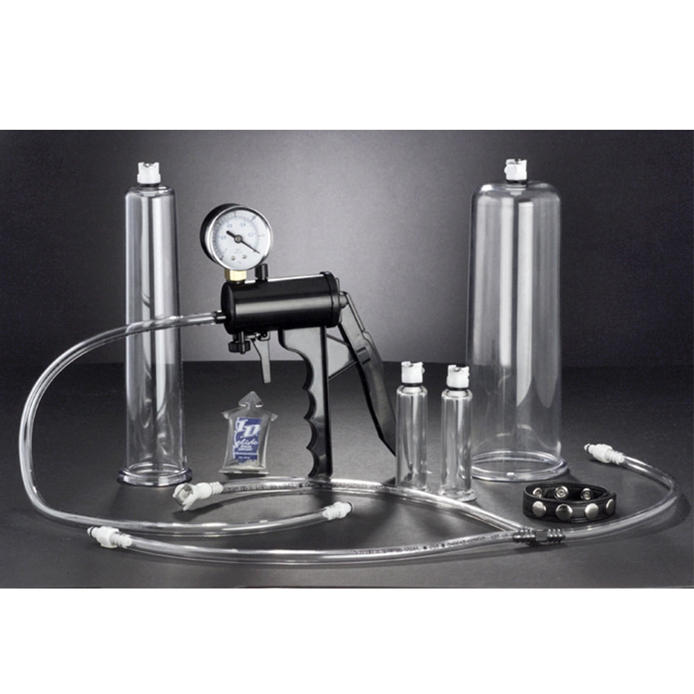 This complete set was made for those looking for a quality pumping gear at a solid value. The set comes complete with Deluxe Hand Pump with Pressure Gauge, your choice of penis cylinder, our 2.75 inch scrotum cylinder, nipple cylinders, nipple cylinder buddy connector (used to facilitate even pressure between cylinders while pumping nipples), leather cock strap and a sample pack of ID Glide Lubricant. Includes an instructional pumping guide to get the most growth out of your equipment.