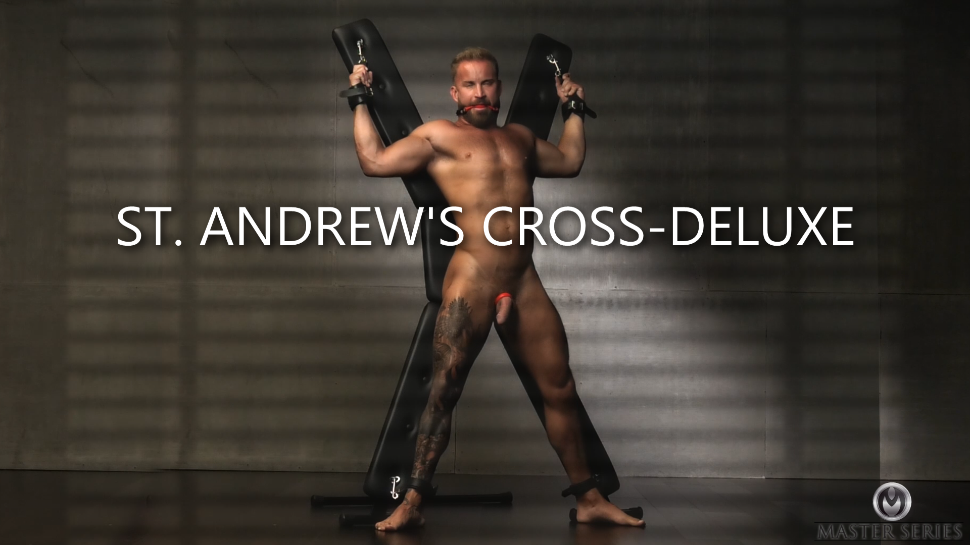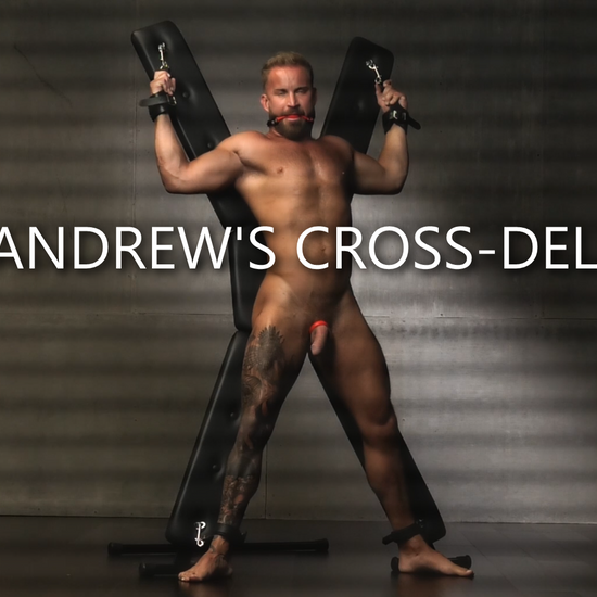 You only met a few hours ago and you're already back at your place. You knew it was a perfect match when you saw a picture of him tied up in rope and gagged online. As he walks in you see him pause as he sees the massive cross standing in your bedroom. He gives you a sideways look and bites his lip. You start to make out, tear each other's clothes off, and he starts sucking your cock. You grunt in pleasure as he handles your balls and massages your ass. You push him on the bed and taste him, swallowing his cock and then coming up to spit in his face. You grin and grab the cuffs you have hiding under your bed. Once each of his wrists and ankles are cuffed, you push him against the cross, his bare ass exposed, his cock pressed against the cushions, and start to paddle and flog him. He moans as his ass turns red. As you start to explore his ass with your hand, you grab some lube and then start to slide it in. He arches his back and gasps, and you know he's a true bottom because you're in so fast that it even surprises you. As you pound his hungry hole, his grunts and moans are muffled as he buries his face in the cushions covering the firm wood of the cross.