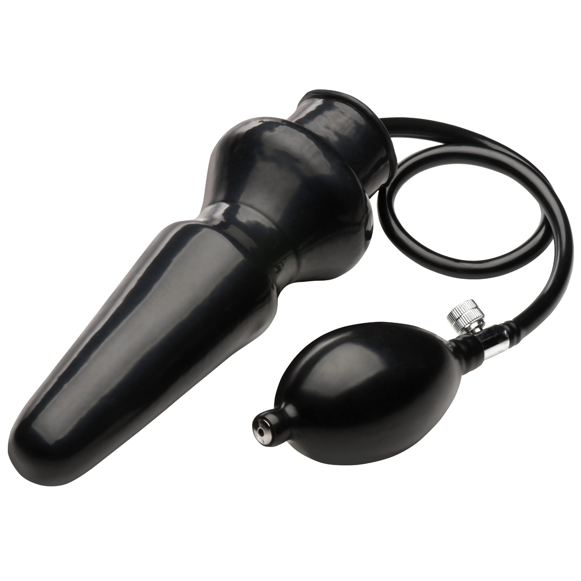 This inflatable plug has a rigid core to make insertion easier. Of course, at two inches wide uninflated, it certainly isn't easy. Once the plug is in every pump will expand the latex skin. Since the skin is flexible it won't expand evenly. It will expand to fill you up in whatever ways offer the least resistance, molding itself to your insides and stuffing you to the maximum possible capacity. It's a great tool for pushing yourself to handle bigger toys than ever before. When you feel like you can't take it any longer, the quick release will shrink it back to its original size.