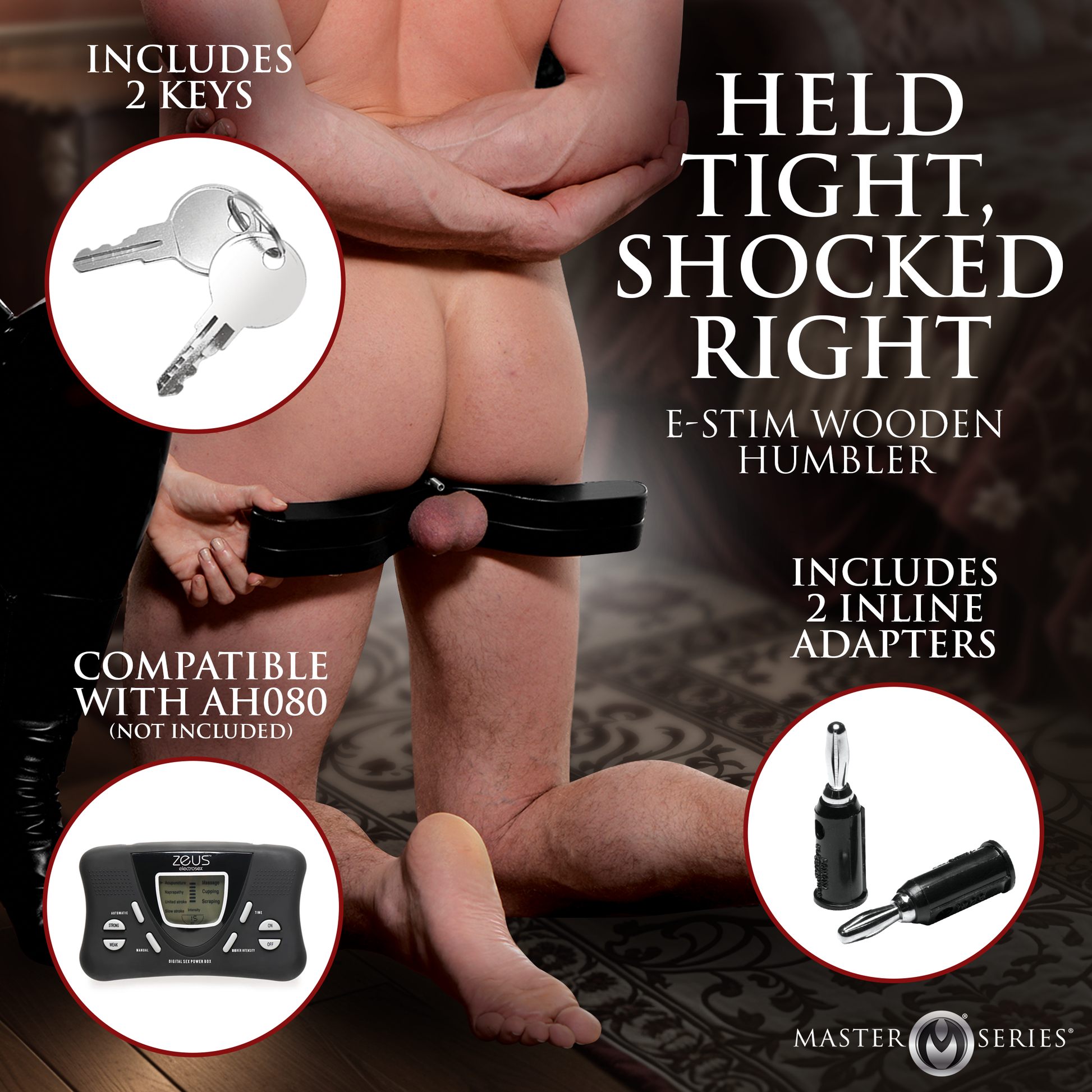 The position the humbler puts him in is just as punishing as the electricity. Balls locked forward at crotch level makes standing upright physically impossible. He stays on his knees, bent over at the waist, face up and looking at you while you take your time deciding how much current to run and when to run it. Slap his balls, rub them, run a long slow pulse through the scrotum and watch him try to hold still. Two inline adapters connect to most e-stim power boxes so you can dial it exactly where you want it, from a low hum that keeps him on edge to something that snaps his full attention back to you immediately. Built-in lock with two keys, safety release on one side by hand. Lacquered wood, brass, and stainless steel. It is as handsome as it is merciless.