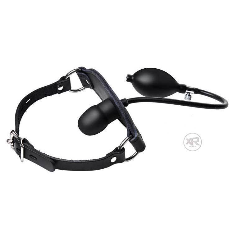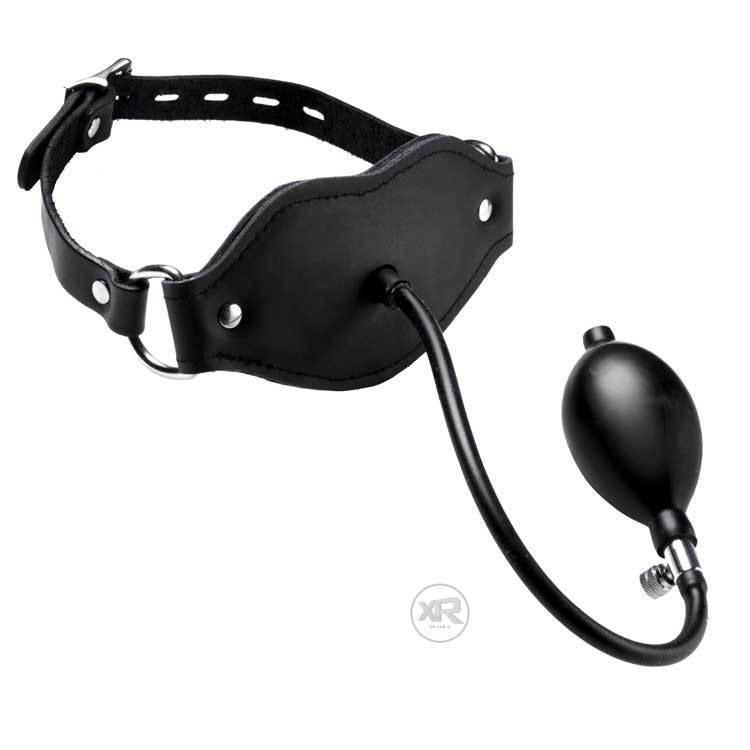 The inflatable penis gag will lock onto the wearers head and can be pumped to gag the mouth full of silicone shaped like a penis. Be careful not to inflate past the wearers limits; this silicone penis definitely can take a lot more than the wearer can.