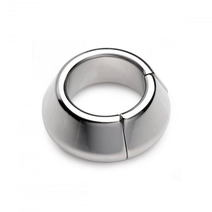 Weighing in at 8.6 ounces, this heavy-duty stainless steel ball stretcher allows gravity to take its toll! The two magnetic pieces wrap around your scrotum to securely clamp together. Take care to keep your delicate flesh from pinching between them, then enjoy the tantalizing tug. The parachute-style shape of the stretcher is narrower at the top where is encircles your sack, and wider around where it sits heavily on your balls. Wear the Magna-Chute while you're jacking off or in chastity, fucking or getting fucked by your man. The chrome-plated stainless steel is non-porous and nickel-free.