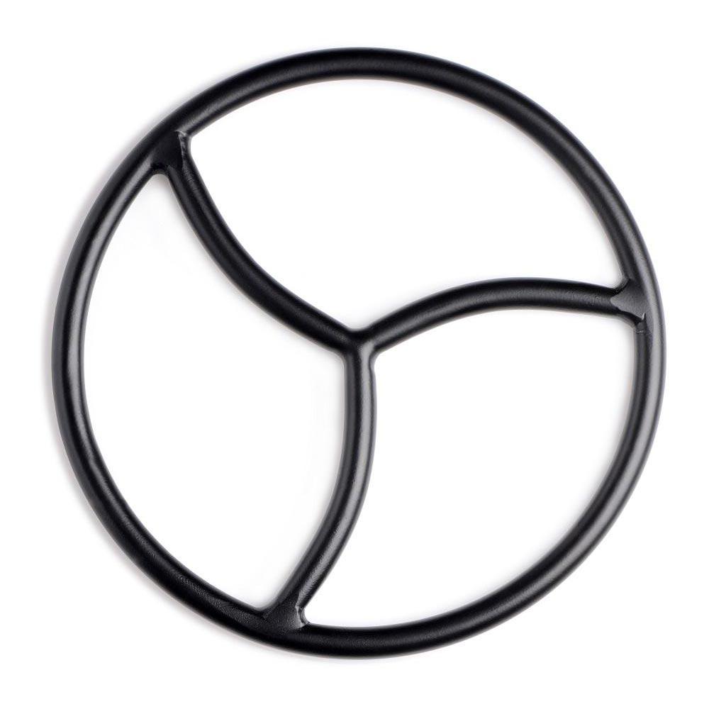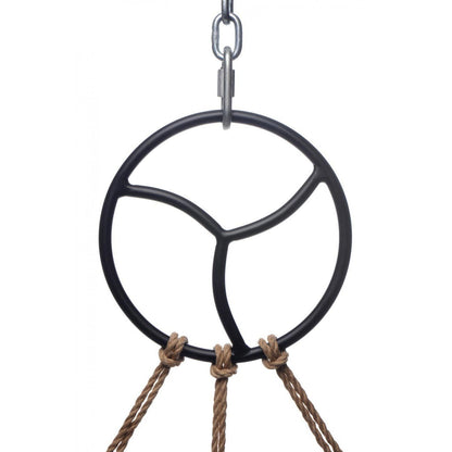 This suspension ring was designed with sturdy metal to accommodate your most gravity-defying sexual endeavors, including shibari and other rope bondage. This handsome accessory is welded into the symbol of the BDSM ethical code: Safe, Sane, and Consensual. Each elegant curve provides an attachment point for your chosen mode of bondage, be it rope, chain, silk, or something else!