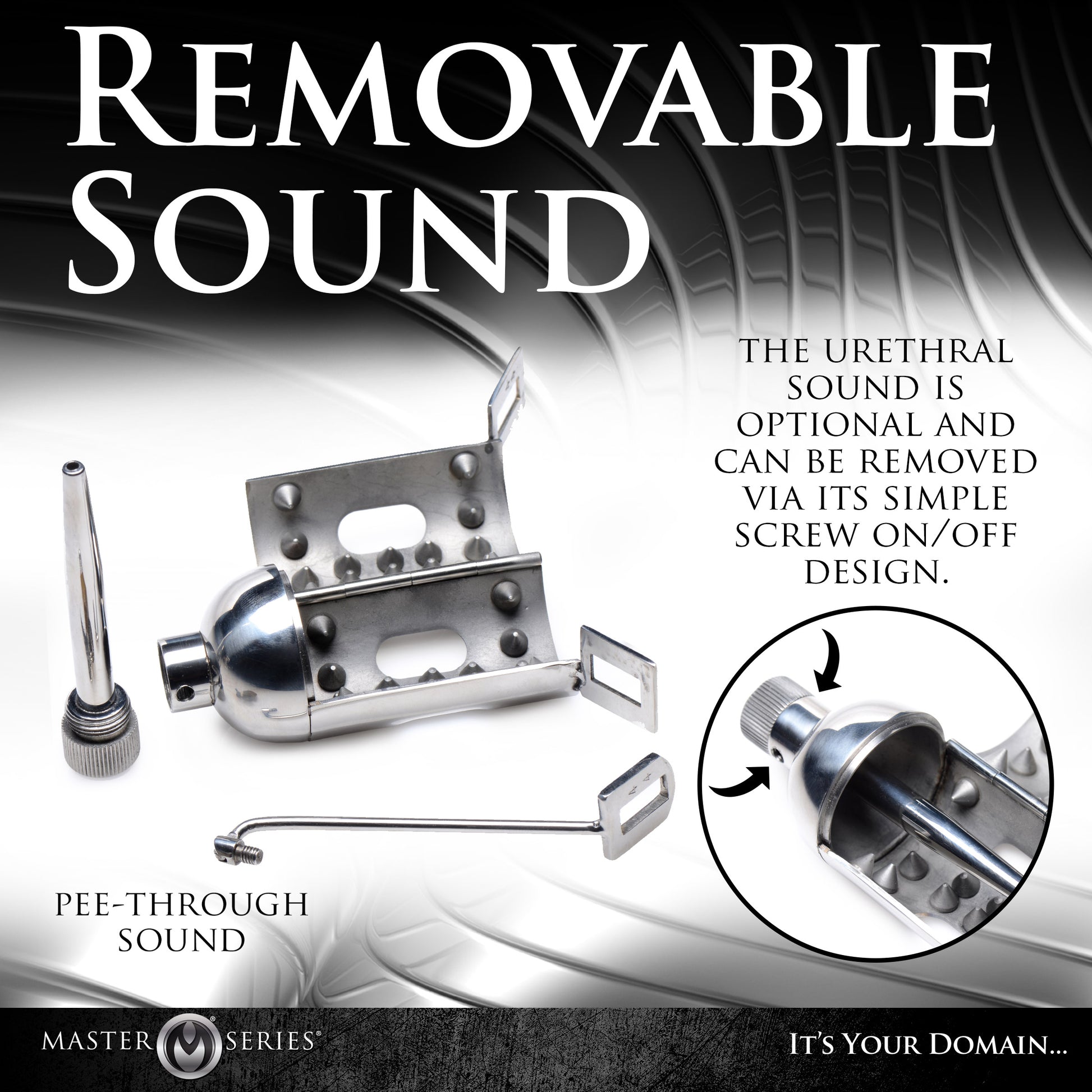 This savage set of heavy metal chastity is ready to imprison you (or your man) in a coffin of spikes! Built for BDSM and chastity enthusiasts, this spiked lined cage is included with a pee through sound and ball ring, all designed to be locked together with the included lock and key. Enforce your power over your slave, or submit to the power of your dom!