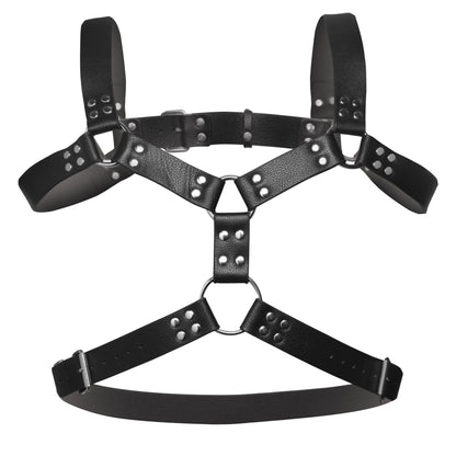 This versatile, sexy harness will make your lovers and admirers want to grab hold of you and pull you into their embrace! Dress boldly and live on the wild side, both in and out of the bedroom with this quintessential symbol of gay leather culture! Transform your look with our fully adjustable chest harness. This exceptional piece is crafted from durable vegan leather that mimics the texture and feel of real leather, making it a perfect fit for both seasoned adventurers and curious newcomers. Equipped with six strategically placed O-rings, you have endless possibilities to attach your favorite accessories, chains, or bondage items. With nickel-free metal hardware, it’s safe and comfortable for those with sensitive skin. Wear it on bare skin, over a fishnet shirt, or as a stylish and daring accessory over a button down shirt. Feel the thrill and take your style and play to the next level while flagging your kinky side.